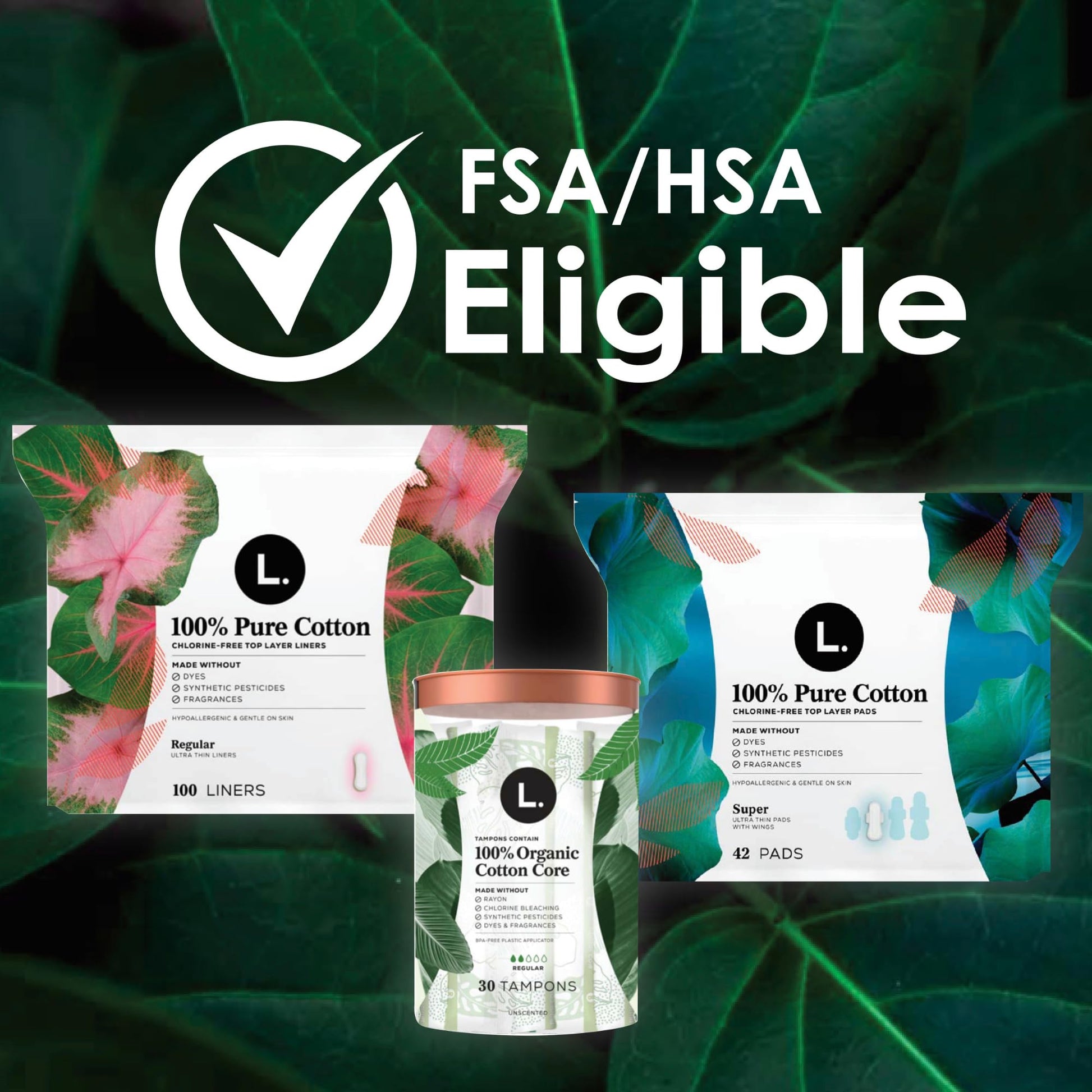- Organic tampons free of chlorine bleaching, pesticides, rayon, fragrances, or dyes