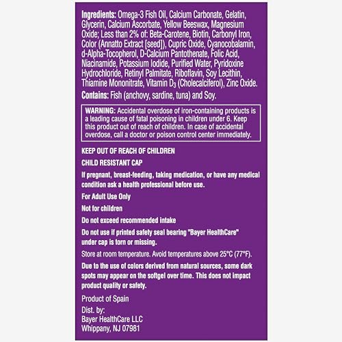 Details: One A Day Women's Prenatal 1 is a complete Prenatal multivitamin that offers a wide variety of key nutrients in an easy-to-take Softgel designed for women through every stage of pregnancy. Adding a Prenatal multivitamin to your daily routines is an important step in providing nutritional support for pregnant women and babies throughout pregnancy and breastfeeding. This daily Prenatal multivitamin contains key nutrients such as Folic Acid, Omega-3 DHA, Calcium, Vitamins A, B6, B12, C, D, and E, Iron, Thiamin, Riboflavin, Niacin, Biotin, Iodine, Magnesium, Copper, Pantothenic Acid, and Zinc. DHA is an Omega-3 fatty acid that can help support healthy fetal brain and eye development. This easy-to-take Softgel supports the earliest and most critical stages of pregnancy, and it is commonly recommended to begin a Prenatal vitamin routine before you get pregnant. One A Day Women's Prenatal multivitamins are the #1 OB/GYN recommended over the counter brand of Prenatal multivitamins. One A Day Multivitamins can provide nutritional support that you and your growing family may need at every life stage.