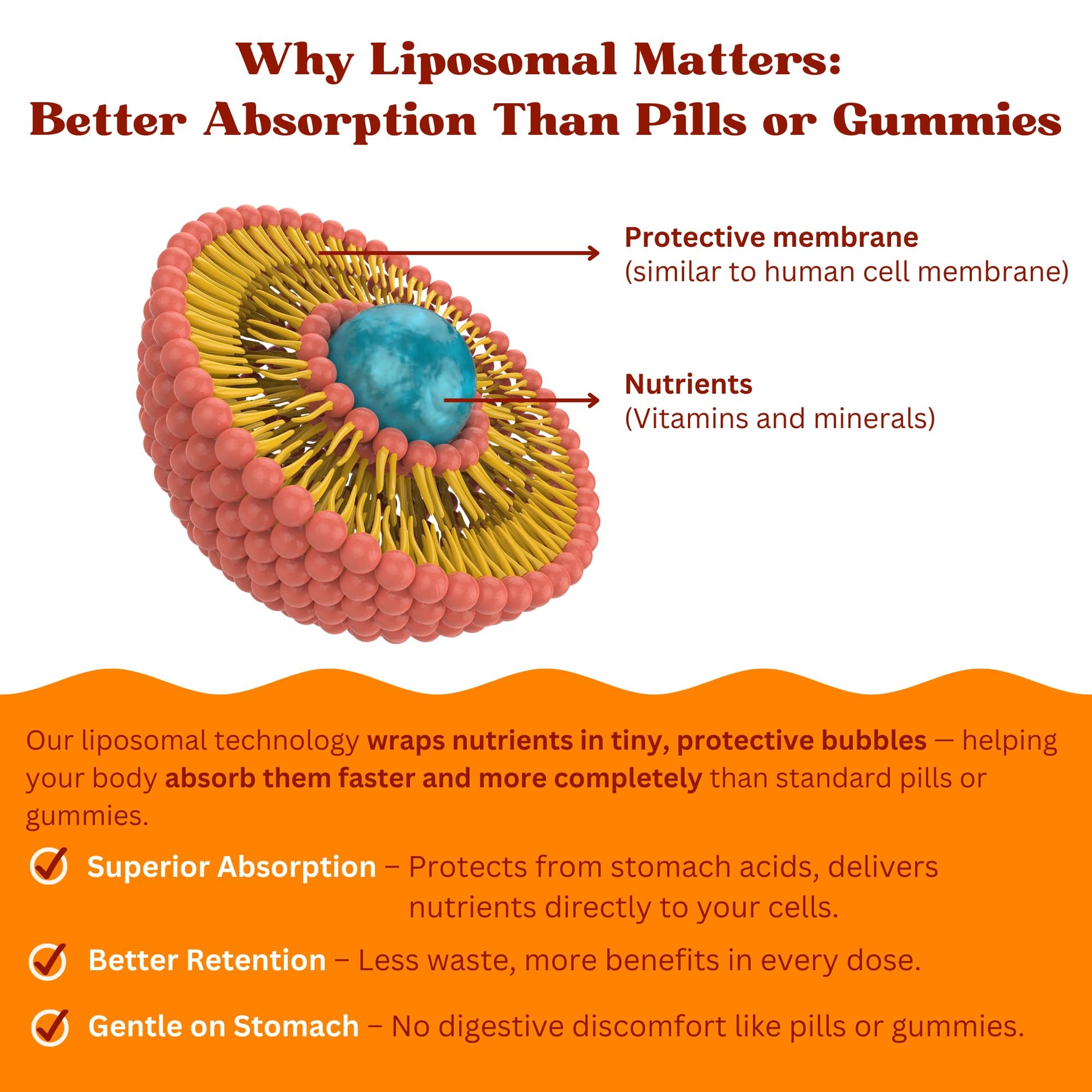 - Liposomal Delivery for Maximum Nutrient Absorption – Our advanced liposomal multivitamin liquid wraps nutrients in tiny “bubbles” for faster, more complete absorption than pills or gummies — so your body gets more of what it needs.